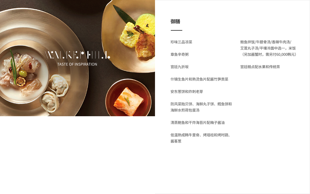 在宫廷料理、士大夫料理的基础上, 重新诠释了朝鲜王朝的文献, 以多样的烹饪方法和甄选的最佳食材呈现的顶级韩式料理。