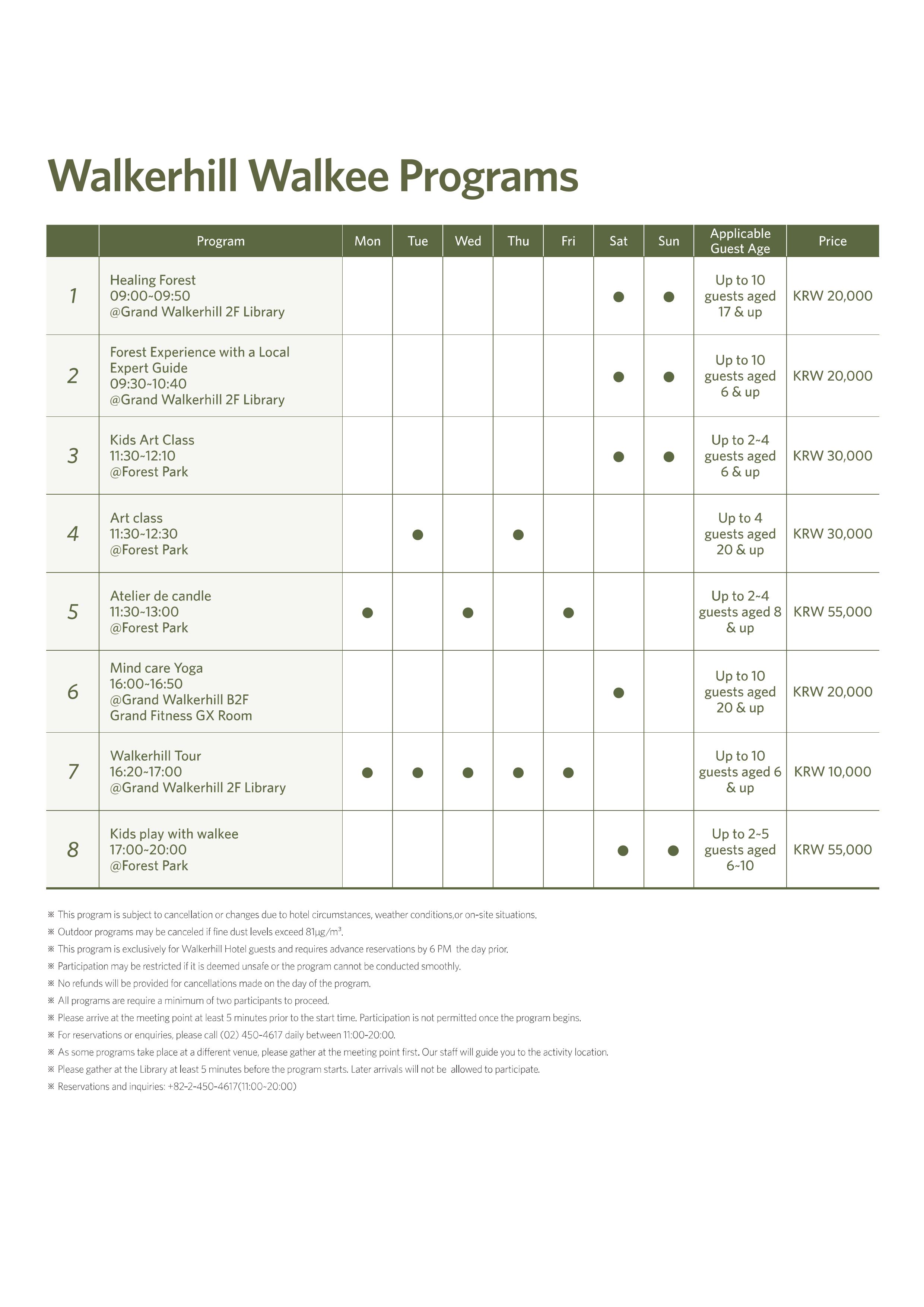 WALKEE programs are exclusively open to Walkerhill Hotels & Resorts guests. Walkerhill leisure expert WALKEE, short for "Walkerhill Exciting Explorer", helps customers experience various fun activities on and around the Walkerhill Hotel & Resort Seoul Complex.